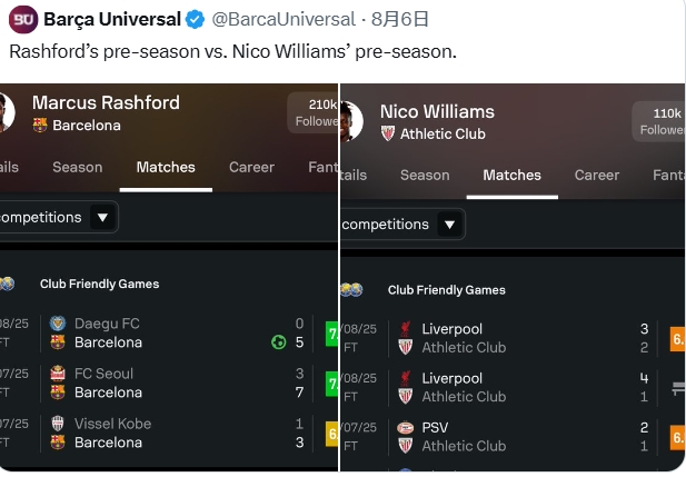 西班牙媒体eldesmarque报道,此前众多网友在社媒批评尼科与毕尔巴鄂续约后的季前赛表现,还有巴萨球迷号拿尼科与拉什福德季前赛表现对比。